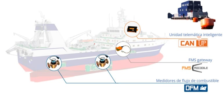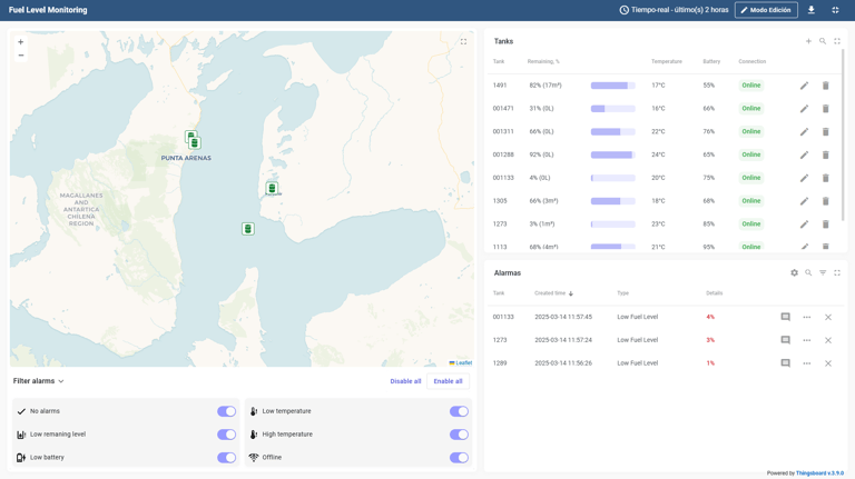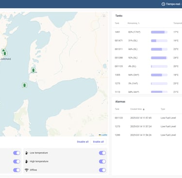 Un computador IoT “a bordo” combinado con sensores capturan la información de nivel y consumo, permitiendo un control en línea de: