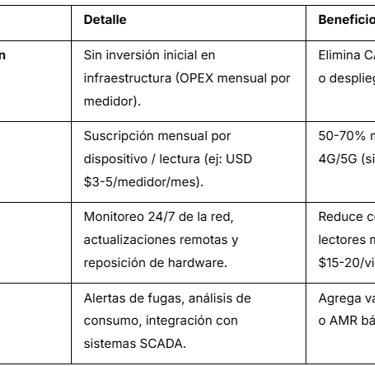 b-konnet ofrece una solución integral de telemetría avanzada para medición de agua, combinando su red LoRaWAN propietaria con tecnología IoT de bajo consumo y alta confiabilidad. Este modelo supera los sistemas manuales y redes celulares tradicionales en costos, escalabilidad y funcionalidad.